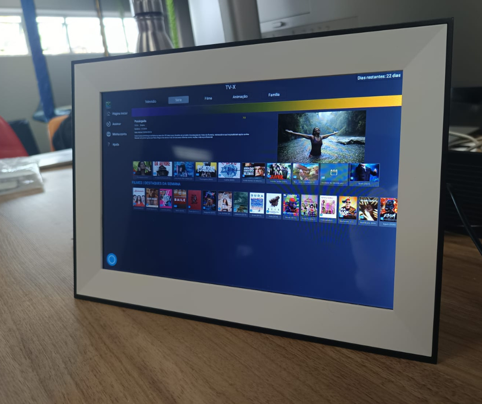 Essa tela funciona como uma mini televisão inteligente. É só ligar, conectar no Wi-Fi e começar a assistir. Não precisa instalar nada, já vai configurada com um aplicativo exclusivo de entretenimento.